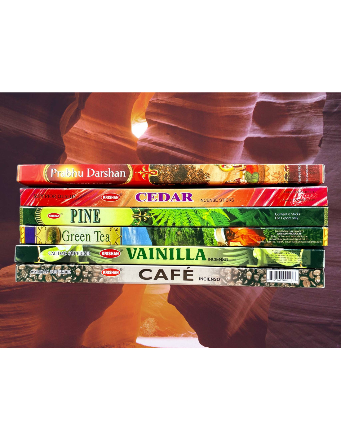 Zestaw 6 opakowań kadzidełek zapachowych, w każdym opakowaniu znajduje się 8 sztuk kadzidełek.